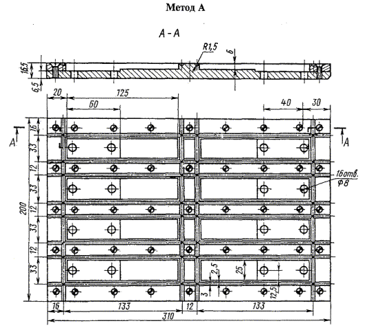 2.8. При испытании по методам А и В металлические пластины и заготовки из резиновой смеси помещают в пресс-форму, предварительно нагретую до температуры вулканизации. Один из вариантов пресс-формы приведен в приложении 2. При испытании по методу В собирают образец из металлической пластины и резиновой заготовки, как указано на черт. 2.
