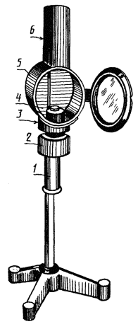 1 - резервуар; 2 - втулка для резервуара; 3 - камера; 4 - направляющая фитиля; 5 - шкала; 6 - вытяжная труба