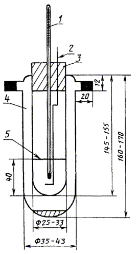 3.1. Сосуд для пробы - сосуд с двойными непосеребренными стенками типа сосуда Дьюара, образующий внутреннюю пробирку (наружный диаметр 22 мм, внутренний диаметр 18 мм) для пробы и наружную стеклянную пробирку (наружный диаметр 30 мм, внутренний диаметр 26 мм), пространство между которыми заполнено сухим азотом или воздухом при атмосферном давлении. Ввод сосуда для пробы закрывают пробкой со вставленным в нее термометром и уплотнением, через которое проходит мешалка.