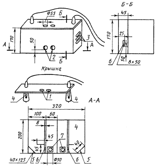 3.1.6. Прибор с зеркальным отражением света (черт. 2) для лучшего наблюдения помутнения и появления кристаллов в топливе. Прибор представляет собой металлический или деревянный с огнестойким покрытием прямоугольный ящик, разделенный глухой перегородкой пополам на два отделения одинакового устройства. Каждое отделение, в свою очередь, разделяется на два отсека по всей высоте перегородкой с отверстием - щелью для прохождения отраженного света и выступом, расположенным перпендикулярно к ней. Ящик снабжен крышкой с двумя вмонтированными электролампами мощностью 100 - 150 Вт, которые при закрывании крышки располагают в крайних отсеках, и с двумя отверстиями для опускания пробирок с испытуемым топливом в средние отсеки ящика. Передняя стенка ящика имеет два отверстия для наблюдения за испытуемым топливом.