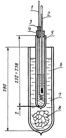 1 - мешалка; 2 - термометр; 3 - уплотнение; 4 - пробка; 5 - сосуд для пробы; 6 - сосуд Дьюара внутренним диаметром 70 мм, 7 - охлаждающее средство, 8 - твердая углекислота