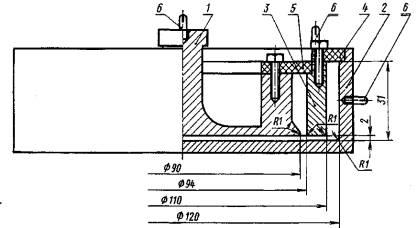1 - измерительный электрод (внутренний); 2 - высоковольтный электрод (внешний); 3 - охранный электрод; 4, 5 - прокладки из твердого изоляционного материала с высоким электрическим сопротивлением; 6 - зажимы для соединения с измерительной схемой