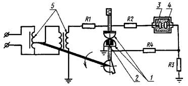 1 - шаровой разрядник; 2 - поджигающий электрод; 3 - сосуд с жидким диэлектриком; 4 - электроды в жидкости; 5- повышающий и регулировочный трансформаторы R1-R4 сопротивления
