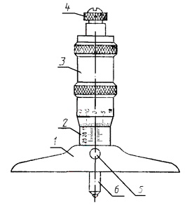 1 - основание; 2 - стебель; 3 - барабан; 4 - трещотка (фрикцион); 5 -стопор; 6 - измерительный стержень
