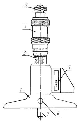 1 - основание; 2 - стебель; 3 - барабан; 4 - трещотка (фрикцион); 5 - табло цифрового устройства; 6 - стопор; 7 - измерительный стержень