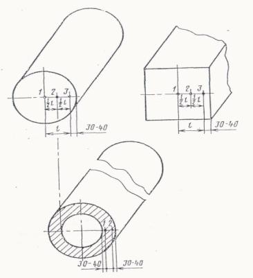 3.13. Для сортового проката диаметром или стороной квадрата 28—50 мм используют все сечение темплета в соответствии с черт. 3, 4 приложения 3. Для сортового проката диаметром более 50 мм из темплета вырезают образец шириной 40 мм симметрично диаметру или диагонали длиной через все сечение темплета в соответствии с черт. 5, 6 приложения 3.