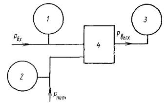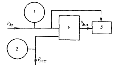 1 - образцовый прибор для задания (измерения) входного давления; 2 - прибор для контроля давления воздуха питания; 3 - образцовый преобразователь; 4 - поверяемый прибор