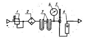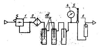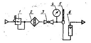 1 - регулятор давления; 2 - фильтродержатель с фильтром аналитическим типа АФА-ВП; 3 - кран муфтовый латунный; 4 - манометр образцовый или U-образный; 5 - термометр; 6 - ротаметр типа РМ