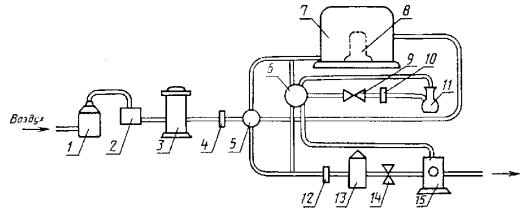 1 - осушитель; 2 - фильтр поглотительный; 3 - озонатор; 4, 10, 12- ротаметр; 5 - распределительный кран; 6 - кран системы отбора проб; 7 - камера для испытаний; 8 - ксеноновая лампа со светофильтром (только в установке для испытаний на термосветоозонностойкость); 9, 14 - регулировочный вентиль; 11 - колба для отбора проб; 13 - камера разложения озона; 15 - вакуумный насос