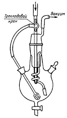 В колбу (см. чертеж) наливают 200 см3 раствора йодистого калия и присоединяют ее к озонной установке. Озонированный воздух пропускают через раствор до появления желтой окраски. Тотчас после отбора пробы озонированного воздуха в колбу добавляют 0,5 см3 раствора уксусной кислоты, раствор переливают в стакан и титруют тиосульфатом натрия (раствором концентрации 0,1 или 0,01 моль/дм3, в зависимости от предполагаемой концентрации озона) до слабо-желтой окраски.