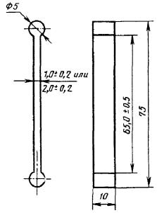1.3. Образцы для определения tт, tи, сmax и Еп должны иметь размеры {(120,0 ± 1,0) ´ (10,0 ± 0,5) ´ (2,0 ± 0,2)} мм; для определения tр - {(120,0 ± 1,0) ´ (10,0 ± 0,5) ´ (0,5 ± 0,1)} мм.