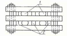 1.3.3. Помещают образцы и ограничители между пластинами струбцин и подвергают образцы деформации сжатия, затягивая болты до соприкосновения с ограничителями. При этом образцы не должны соприкасаться друг с другом и с ограничителями.