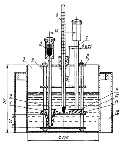 1 - стальное кольцо; 2 - стальной стержень; 3 - металлическая ванна; 4 - стойка корпуса; 5 - свинец; 6 - термометр; 7 - отметка на стержне; 8 - полка корпуса; 9 - пек; 10 - термостатирующая жидкость; 11 - металлическая подставка для кольца; 12- экран