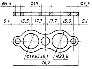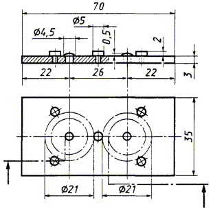 - опора кольца (размеры и форма показаны на черт. 4 и 7) состоит из двух параллельно расположенных латунных пластин, одна под другой на расстоянии (25 ± 0,5) мм.