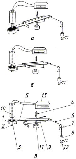 Электромагнит разобщает держатель с удерживающим его рычагом 10. При этом таблетка пека в обойме держателя под действием вращающего момента, создаваемого грузом, стремится повернуться в направлении, указанном стрелкой, и удерживается от поворота только силами сцепления пека с нагревателем (черт. 10, в).