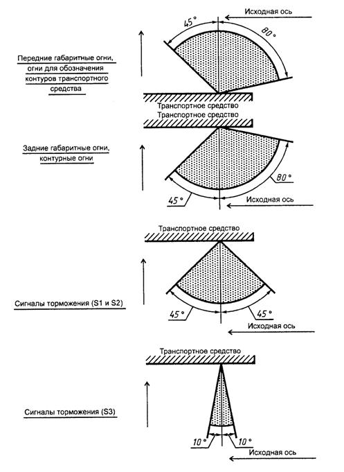 Ключевые слова: передние габаритные огни, задние габаритные (боковые) огни, контурные огни, сигналы торможения, фотометрические характеристики, цвет испускаемого света