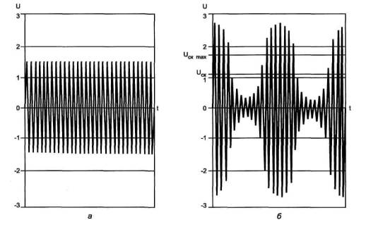 4.17 Максимальное среднеквадратичное значение - наибольшее кратковременное среднеквадратичное значение напряжения модулированного радиочастотного сигнала на интервале наблюдения, равном одному периоду модулирующего сигнала. Кратковременное среднеквадратичное значение определяется дискретно на каждом периоде несущей частоты. Например, для радиочастотного сигнала, приведенного на рисунке 1б, максимальное среднеквадратичное значение Uск max составляет: