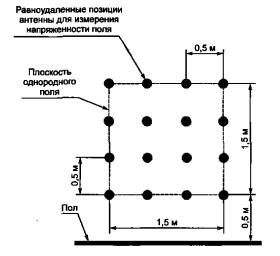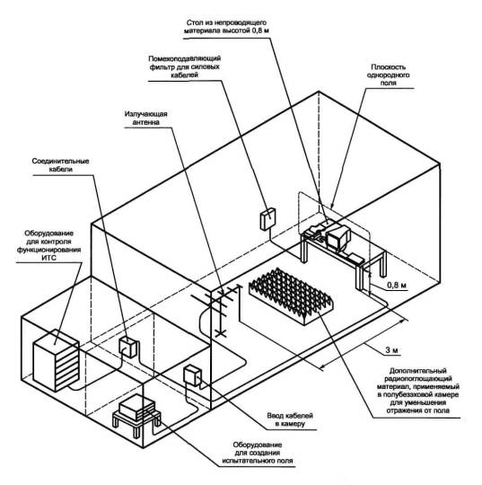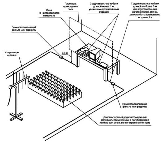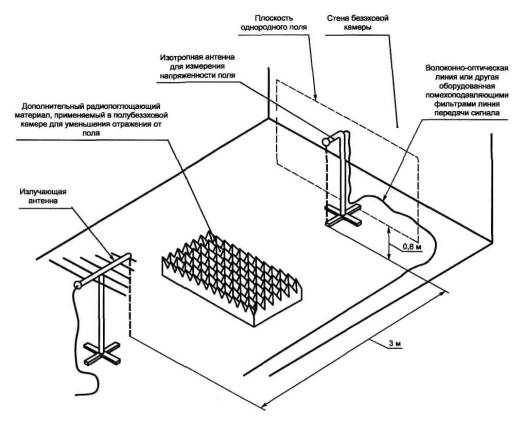 В полубезэховых камерах дополнительная установка радиопоглощающего материала на полу камеры помогает обеспечить требуемую степень однородности испытательного поля на всех частотах. Место размещения радиопоглощающего материала определяют экспериментально.