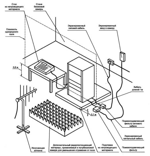4.2 Безэховая камера - экранированное помещение, покрытое радиочастотным поглощающим материалом для уменьшения отражений от внутренних поверхностей.