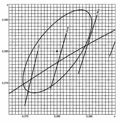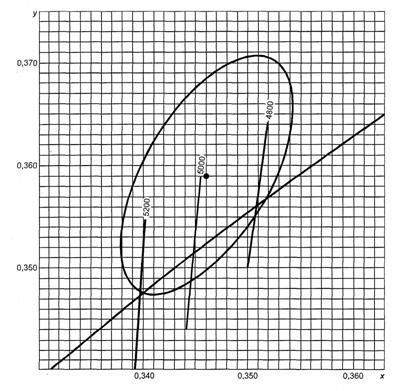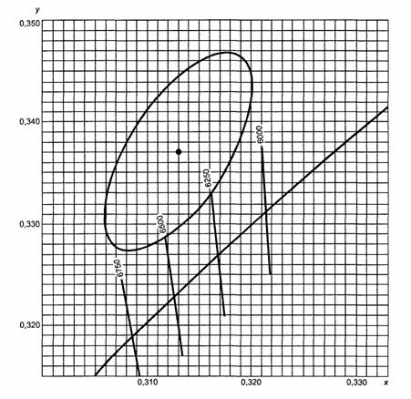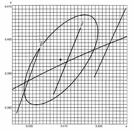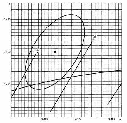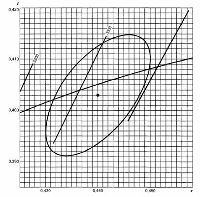 б) начальное значение координат цветности х и у лампы должно быть в пределах 5 СОЦС (стандартное отклонение цвета сравнения) от расчетных значений.