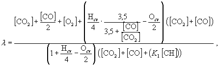 где [СО2], [СО], [О2] - объемная доля диоксида, оксида углерода и кислорода соответственно, %;