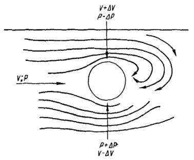 В момент развития вихря скорость потока с одной стороны (например, верхней) несколько возрастает по сравнению со скоростью потока с противоположной (нижней) стороны; при образовании следующего вихря, с обратным направлением вращения, получается обратное соотношение скоростей потока. По закону Бернулли разнице скоростей потока соответствует разница давления - большей скорости соответствует меньшее давление и наоборот. Периодическому образованию вихрей сопутствуют периодические импульсы силы, поочередно действующие на провод на данном его участке то снизу, то сверху (рис. 2.3).