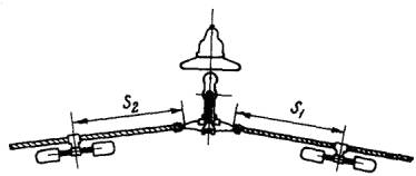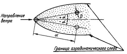 2.4. Другим конструктивным фактором, влияющим на подверженность проводов колебаниям в подпролетах, является наклон к горизонтали пары проводов, создаваемый с целью ослабления воздействия на подветренный провод аэродинамического следа наветренного провода. При этом угол наклона к горизонтали не обязательно должен быть велик настолько, чтобы вывести полностью подветренный провод из зоны действия аэродинамического следа наветренного.