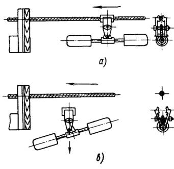 в) установив гаситель, как указано выше (без предохранителя), толкая рукой в торец груза, проверить, как сходят нижние выступы щек с распорной втулки, свободно ли поворачиваются щеки на болте, освобождая провод, и как сбрасывается гаситель с провода.