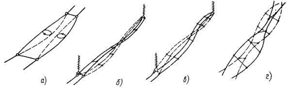а - колебания проводов в подпролетах; б - вертикальные колебания; в - горизонтальные колебания; г - крутильные колебания