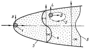 L - подъемная сила; D - сила лобового сопротивления; 1 - наветренный провод; 2 - траектория движения подветренного провода; 3 - граница аэродинамического следа; 4 - эпюра подъемной силы в сечении следа; 5 - эпюра лобового сопротивления в сечении следа