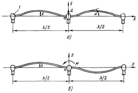 на подпролет; 1 - узел колебаний; 2 - пучность колебаний; λ - длина волны колебаний; А - амплитуда колебаний; a - угол колебаний в подпролетах;