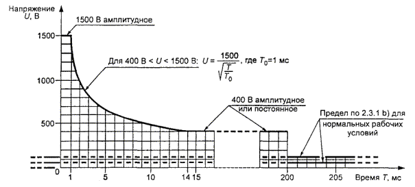 Существует оборудование, которое подключается к телефонным или другим внешним сетям связи. Некоторые ТЕЛЕКОММУНИКАЦИОННЫЕ СЕТИ работают с такими сигналами, как информационные или вызывные, наложенные на установившееся ПОСТОЯННОЕ НАПРЯЖЕНИЕ, в результате чего могут быть превышены величины напряжений в установившемся режиме, приведенные выше. Обычная практика для ОБСЛУЖИВАЮЩЕГО ПЕРСОНАЛА телефонных компаний - касаться руками неизолированных проводящих цепей. Это не вызывает серьезных травм, поскольку прохождение в этот момент вызывного сигнала маловероятно, а области контакта с неизолированными проводниками ограничены. Тем не менее область контакта с частями, доступными ПОЛЬЗОВАТЕЛЮ, и вероятность касания таких частей должны быть ограничены (например, формой и расположением частей).