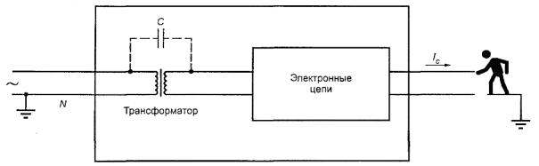 Если цепь не заземлена, то ток IC - через тело человека протекает вследствие «утечки» через паразитную или собственную емкость С и через изоляцию в сетевом трансформаторе (см. рисунок W.1).