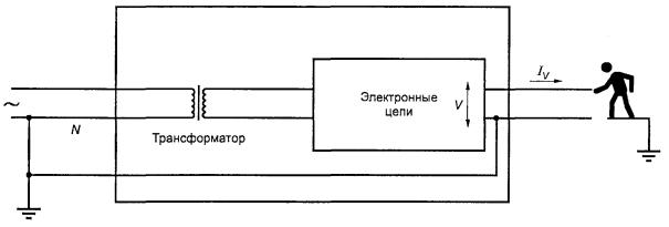 Если электронная цепь заземлена, ток через тело человека Iv зависит от рабочего напряжения U в цепи, являющегося источником более низкого импеданса по сравнению с телом (см. рисунок W.2). Любой ток утечки от сетевого трансформатора (см. W.1.1) будет уходить на землю и не будет проходить через тело человека.