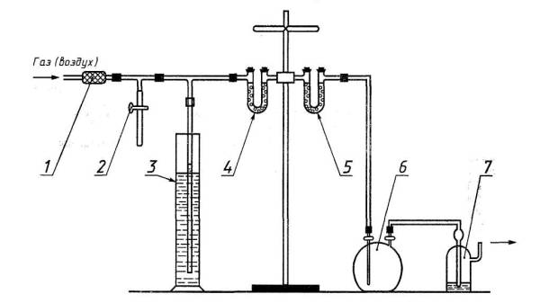 1 - трубка с гигроскопической ватой: 2 - винтовой зажим; 3 - маностат; 4,5 - U-образные трубки; 6 - пикнометр; 7 - склянка (счетчик пузырьков)