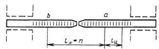 Если место разрыва ближе к краю захвата машины чем величина n/2 (черт. 3), то полученную после разрыва конечную расчетную длину lк определяют следующим образом: