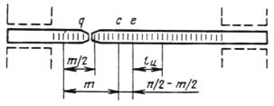 от места разрыва до крайней метки q у захвата определяют число интервалов, которое обозначают т/2. От точки q к месту разрыва откладывают т интервалов и ставят метку с. Затем от метки с откладывают n/2 - т/2 интервалов и ставят метку е.