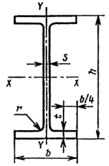 h - высота двутвара; b - ширина полки; s - толщина стенки; t - толщина полки; r - радиус сопряжения; I - момент инерции; W - момент сопротивления; S - статистический момент полусечения; i - радиус инерции.