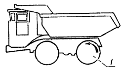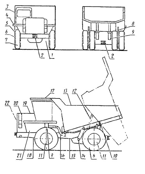5.4.1. Наименования составных частей двухосного землевоза: 1 - бампер; 2 - шкворень буксирного приспособления; 3 - кабина; 4 - крыло; 5 - колесо; 6 - шина; 7 - тормоз; 8 - брус выталкивателя кусков породы; 9 - подвеска (дополнительная); 10 - ось шарнира крепления кузова; 11 - мост (мосты); 12 - стойка, удерживающая поднятый кузов; 13 - кузов; 14 - гидроцилиндр подъема кузова; 15 - система привода; 16 - трубопровод отвода выхлопных газов в атмосферу или на обогрев кузова; 17 - козырек; 18 - основная рама; 19 - капот; 20 - лестница, 21 - силовая установка; 22 - решетка радиатора.