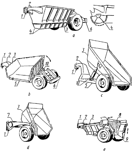 а - донная разгрузка; b - боковая разгрузка; с - задняя разгрузка; d - задняя разгрузка; е - задняя разгрузка