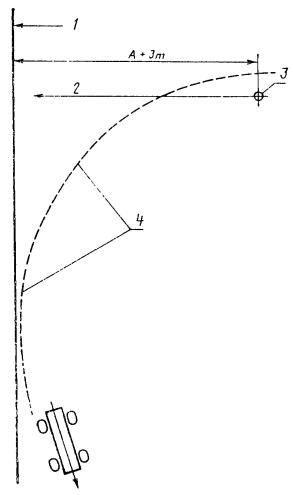1 - перпендикуляр к первоначальному направлению движения; 2 - первоначальное направление движения; 3 - положение А передней оси в момент начала перемещения командного органа; 4 - внешняя линия следа колес