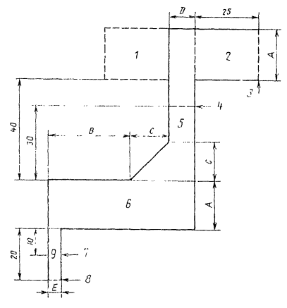 А - в 1,10 раза больше диаметра окружности поворота по следу колес или 14 м (в зависимости от того, какой из размеров больше); В - в 1,75 раза больше диаметра окружности по следу колес или 22 м (в зависимости от того, какой из размеров больше); С - в 2,00 раза больше максимальной колесной базы или 15 м (в зависимости от того, какой из размеров меньше); D - в 2,5 раза больше максимальной ширины по шинам; Е - в 1,25 раза больше максимальной ширины по шинам. Длина коридора: машины с диаметром окружности поворота по следу колес не менее 12 м, колесные тракторы и автогрейдеры должны начинать испытание у линии «Старт 1» и заканчивать у линии «Финиш 1». Остальные машины должны начинать испытание у линии «Старт 2» и заканчивать у линии «Финиш 2». 1 - вариант положения участка № 4; 2 - участок № 4; 3 - финиш; 4 - линия «Финиш 1»; 5 - участок № 3; 6 - участок № 2; 7 - линия «Старт 1»; 8 - линия «Старт 2»; 9 - участок № 1.