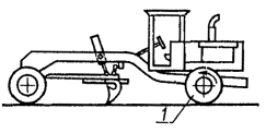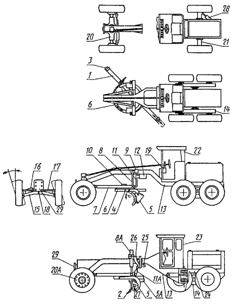 1 - отвал; 2 - нижний нож; 3 - боковой нож; 4 - кронштейн крепления отвала; 5 - кронштейн механизма установки угла резания; 5А - гидроцилиндр установки угла резания; 6 - поворотный круг; 7 - тяговая рама; 8 - тяга механизма подъема отвала; 8А - гидроцилиндр подъема отвала; 9 - механизм подъема отвала; 10 - реверсивный привод поворотного круга; 11 - тяга, механизма выноса тяговой рамы с отвалом; 11А - гидроцилиндр выноса тяговой рамы с отвалом; 12 - механизм выноса тяговой рамы с отвалом; 13 - основная рама; 14 - балансирная тележка с приводом ведущих колес; 15 - передний мост; 16 - гидроцилиндр наклона передних колес; 17 - поперечная тяга наклона колес; 18 - балансирный шкворень переднего моста; 19 - коробка механизма сервоуправления; 20 - ведущий передний мост (механический); 20А - объемный гидропривод передних колес; 21 - ведущий задний мост; 22 - навес с устройством ROPS; 23 - кабина с устройством ROPS; 24 - подмоторная рама; 25 - блокировка рычага подъема; 26 - рычаг подъема; 27 - гидроцилиндр выдвижения отвала; 28 - гидроцилиндр поворота задних управляемых колес; 29 - плита для крепления дополнительного оборудования.