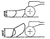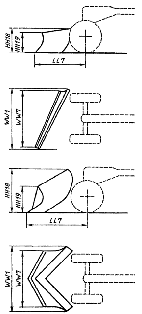 6.1.3. Плужный снегоочиститель - конструкция, размещенная впереди передних колес и предназначенная для сдвигания снега в поперечном направлении за счет вспахивающего действия отвала. Плуг может быть одноотвальным и двухотвальным (см. черт. 18).