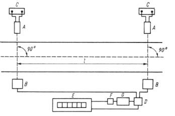 А – источник света; В – светочувствительный транзистор; С – аккумуляторная батарея на 12 В; D – блок управления; E – электронный цифровой счетчик времени; F – преобразователь; G – источник питания (постоянный ток); L – мерный участок испытательного трека