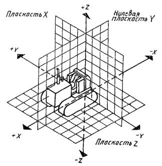 1. Оси X, Y и Z (нулевые плоскости) пересекаются под прямым углом в определенной точке (например, в точке SIP, т.е. контрольной точке сиденья; на осевой линии коленчатого вала двигателя, на осевой линии ведущего колеса или заднего моста трактора, на уровне опорной поверхности при проведении измерений машины).