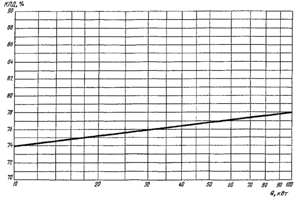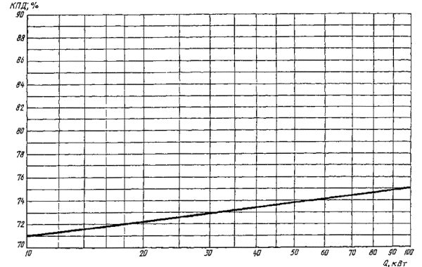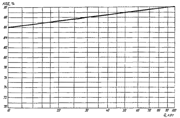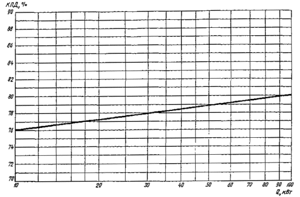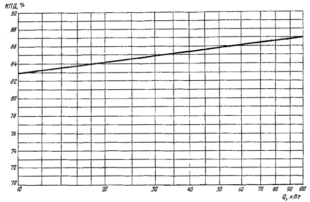 Коэффициент полезного действия котлов, работающих в режиме отопления, должен быть не менее определенного по графикам на черт. 1 - 5. При оснащении котла водоподогревателем допускается снижение этого значения не более чем на 2 %.