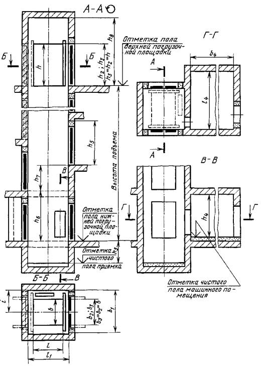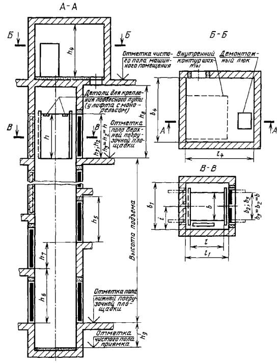 7. Основные размеры (внутренние) кабин, шахт и машинных помещений лифтов обычных, с монорельсом и выжимных должны соответствовать указанным в табл. 3, 4 и на черт. 1, 2.