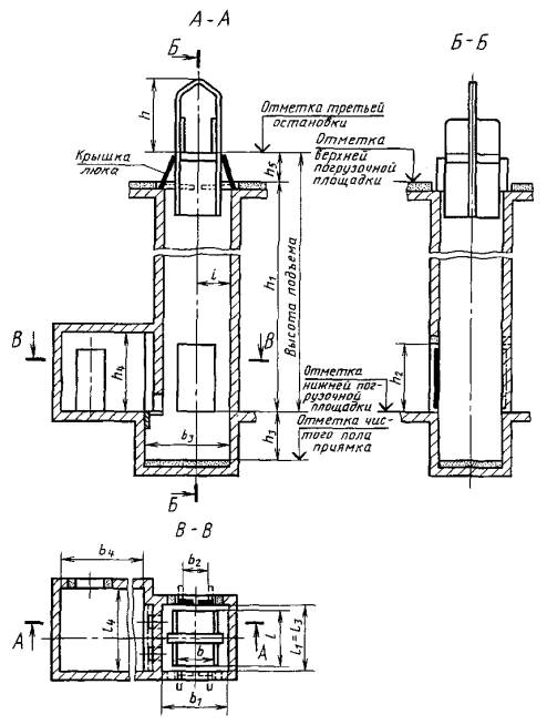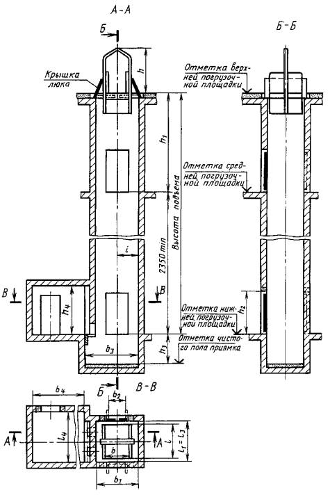 Основные размеры (внутренние) платформы, шахты и машинного помещения лифтов тротуарных должны соответствовать указанным в табл. 5 и на черт. 3, 4.