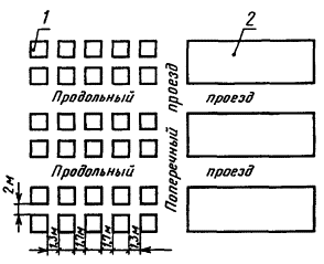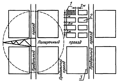 Продольные проезды должны совпадать с направлением господствующего ветра в активный период сушки (апрель-октябрь), а в районах, где господствующий ветер выражен слабо, - в направлении север - юг.
